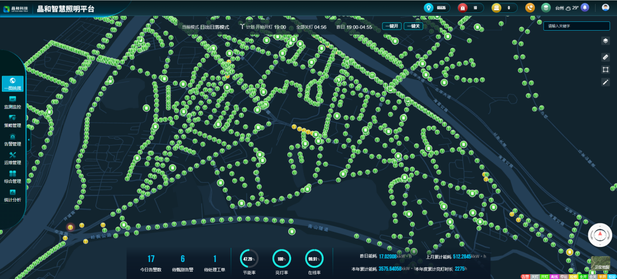 中节能晶和城市智慧照明管理平台 晶和科技基于自主研发的城市智慧照明管理平台,通过运用NB-Iot、4Gcat.1等先进技术,将LED照明灯具接入平台系统,实现远程灯光控制、城市照明一图统览、监控监测、策略管理、告警管理、运维管理等功能,做到按需照明和精细化管理,提高城市照明运行的可靠性与响应速度,点亮数字城市建设的“节能之路”。 与行业内同类型平台相比,该平台具有安全性更高、兼容开放性更强、人力成本更低等多项显著优势。目前,该平台已经在北京、宁夏银川、安徽合肥、江西南昌等20多个城市部署应用,管理灯具近60万盏。